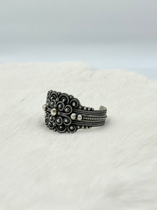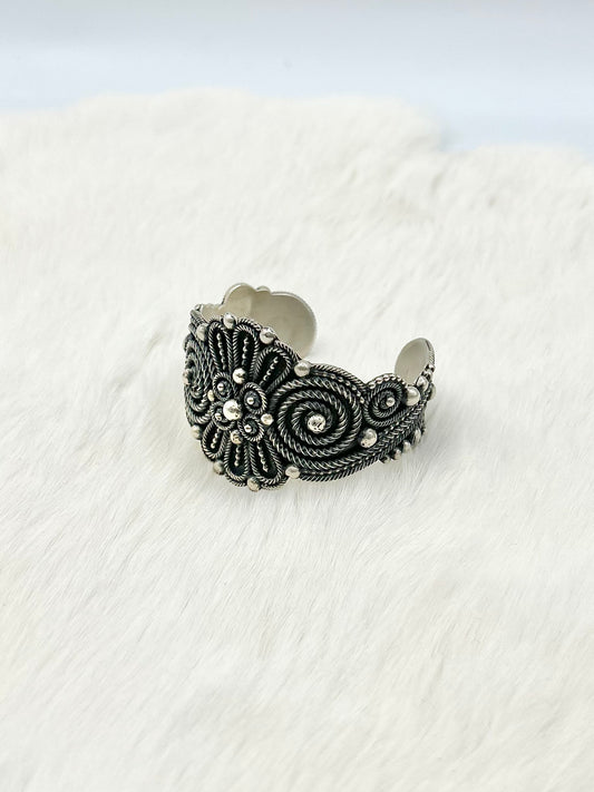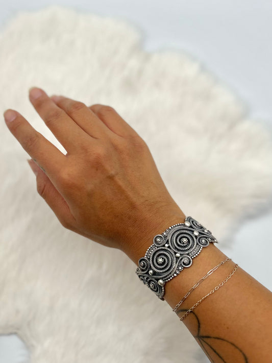 John Begay is a Dine silversmith known for his intricate hand-fabricated jewelry, often featuring twisted sterling silver wire and elaborate, lacelike designs. Deeply spiritual in his process, Begay incorporates prayer and meditation into his work, believing each piece should carry beauty, protection, and intention.